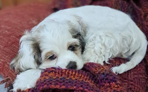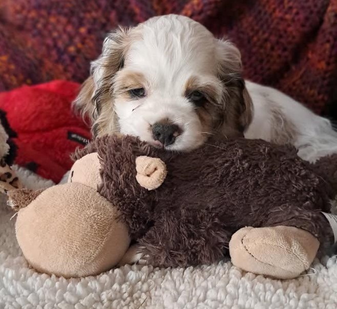 Emily is a Tri-Color Merle mix with tan ears and a small black spot on lower back