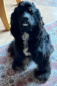 Foster update: Gideon has learned so much in our time together! He is smart, playful, and loving. Gideon is very food motivated-a typical cocker in that regard! This is so helpful with training. He sits upon returning from the back yard and waits for a treat. He still does some marking in house and needs to be monitored. He has been responding to treats when doing his potty outside, as a way of training to not mark in the house. Gideon wants to be a good boy and is busy trying to figure it all out! He rests quietly in his crate during nighttime sleeping. He enjoys 2 to 3 walks a day, loving the wildlife in our area and the abundant smells on the grasses. He is learning to walk on a leash. And he does keep track of his people by following along room to room throughout the house!