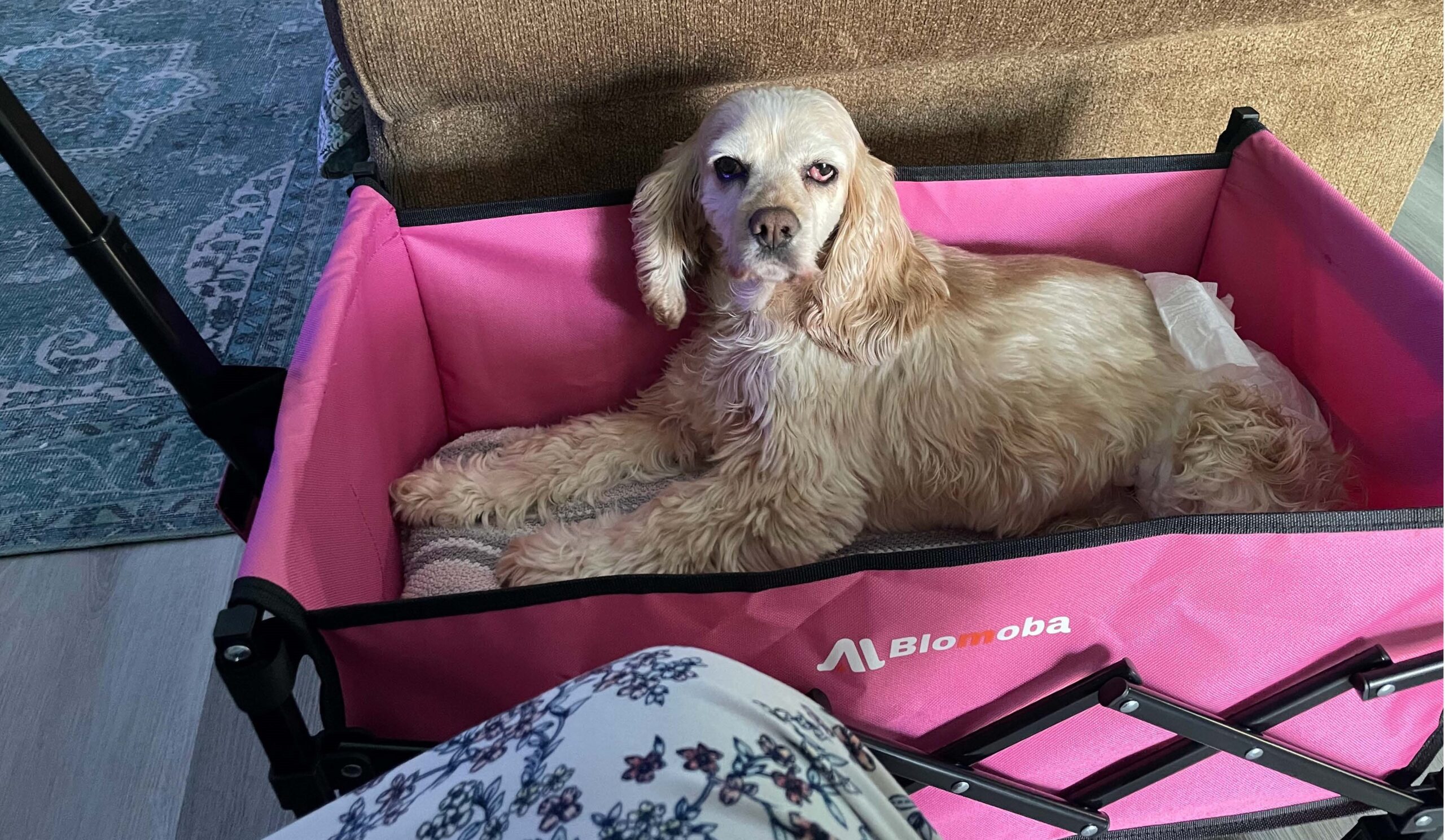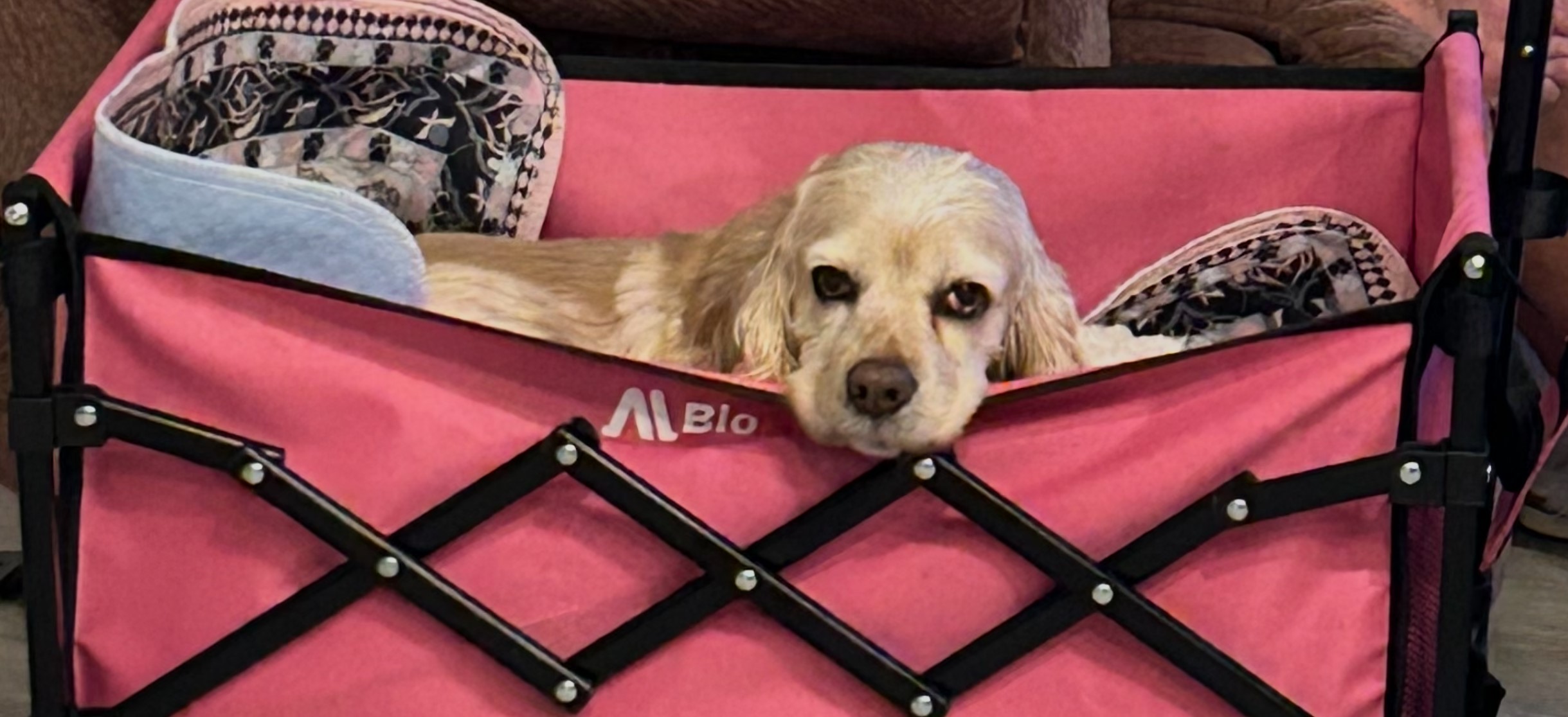 We had a neurology consultation for Honey and the examination confirmed that she is paralyzed and has no feeling within her hind limbs or tail. She most likely has an intervertebral disc herniation (“slipped disc") that has damaged her spinal cord. We have learned that because she has lost all pain sensations in her hind limbs and this occurred some time ago, unfortunately the chances of her walking again are extremely low.  While we will not be able to restore her ability to walk, we can focus on giving her a great quality of life.  We have been referred to a certified veterinary physical rehabilitation specialist who will be able to help Honey with her overall strength and to get her properly fitted for a wheel-cart, a doggie wheelchair. She can pull herself on carpet or grass to move around for a little while. Front leg strength will be important to maintain when she gets into her doggie wheelchair.  Her fosters currently use a little wagon to move her around longer distances. See the photos of her in her cute little pink wagon.