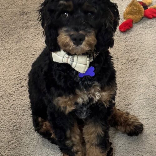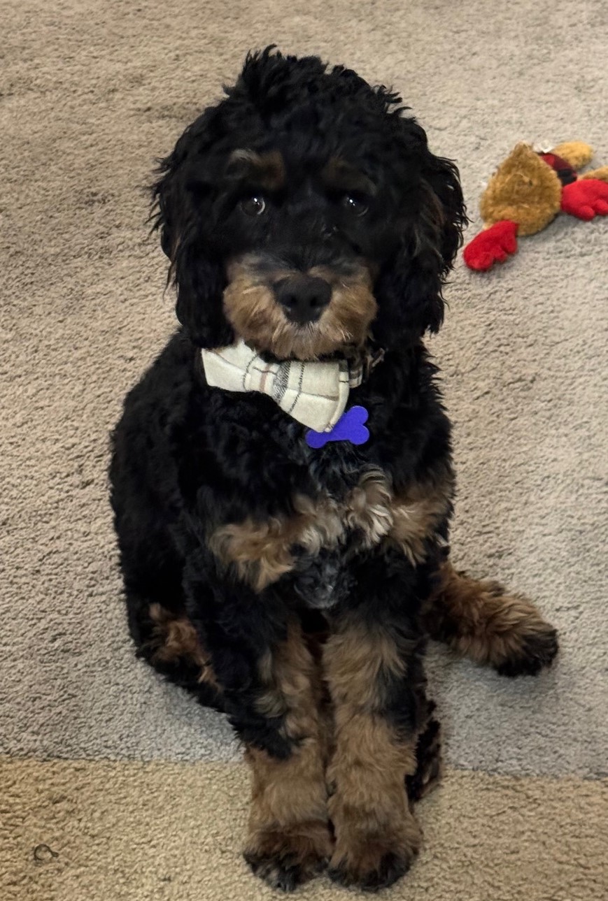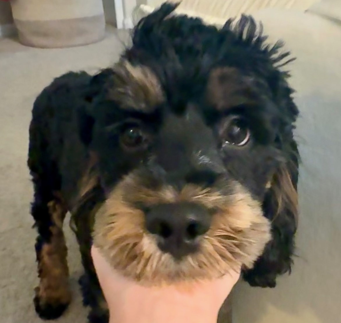 Jefferson is a cute  little black and brown cockapoo with curly hair . He loves to play and chew toys. Totally puppy! Happy go lucky. Loves to try and play with everyone and any animal including dogs, cats, chickens, horses, goats and pigs. Still needs some potty training. Is almost there. Now knows how to use a dog door.